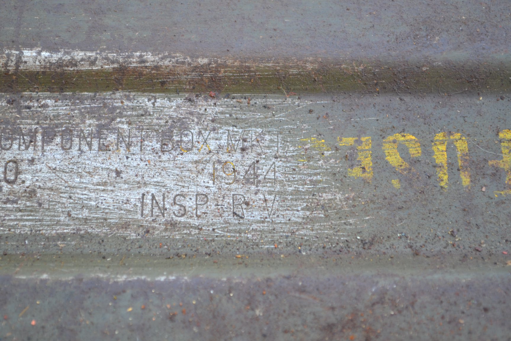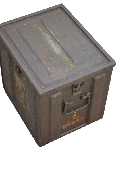 Caisse US Cal .50 M17 WW2 50.0 EUR caisse a munition modèle M17 pour la mitrailleuse de cal.50. Production en tôle avec capot a fermoir et sangle en toile pour le transport. Etat d’origine, marquage au pochoir noir encore présent
