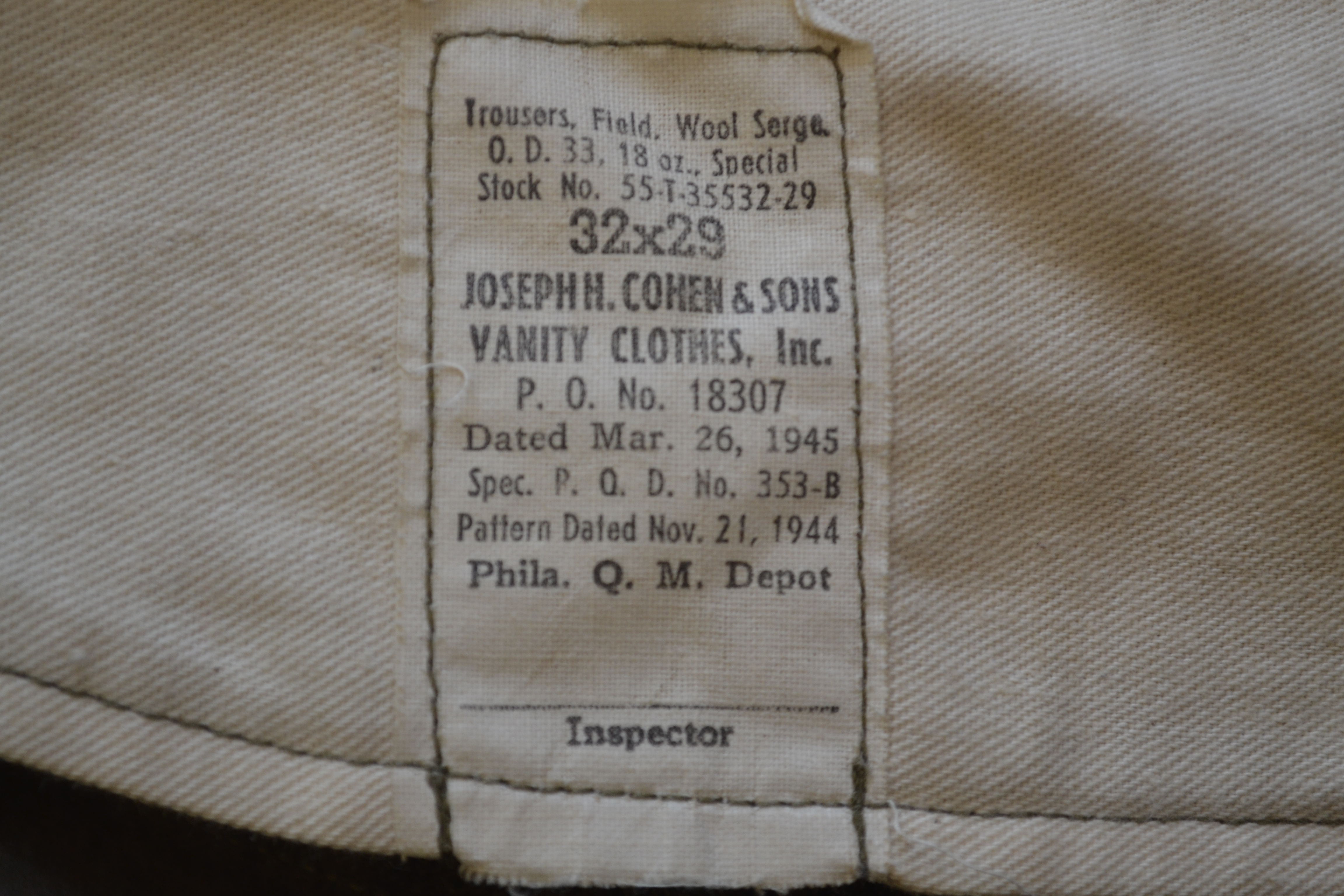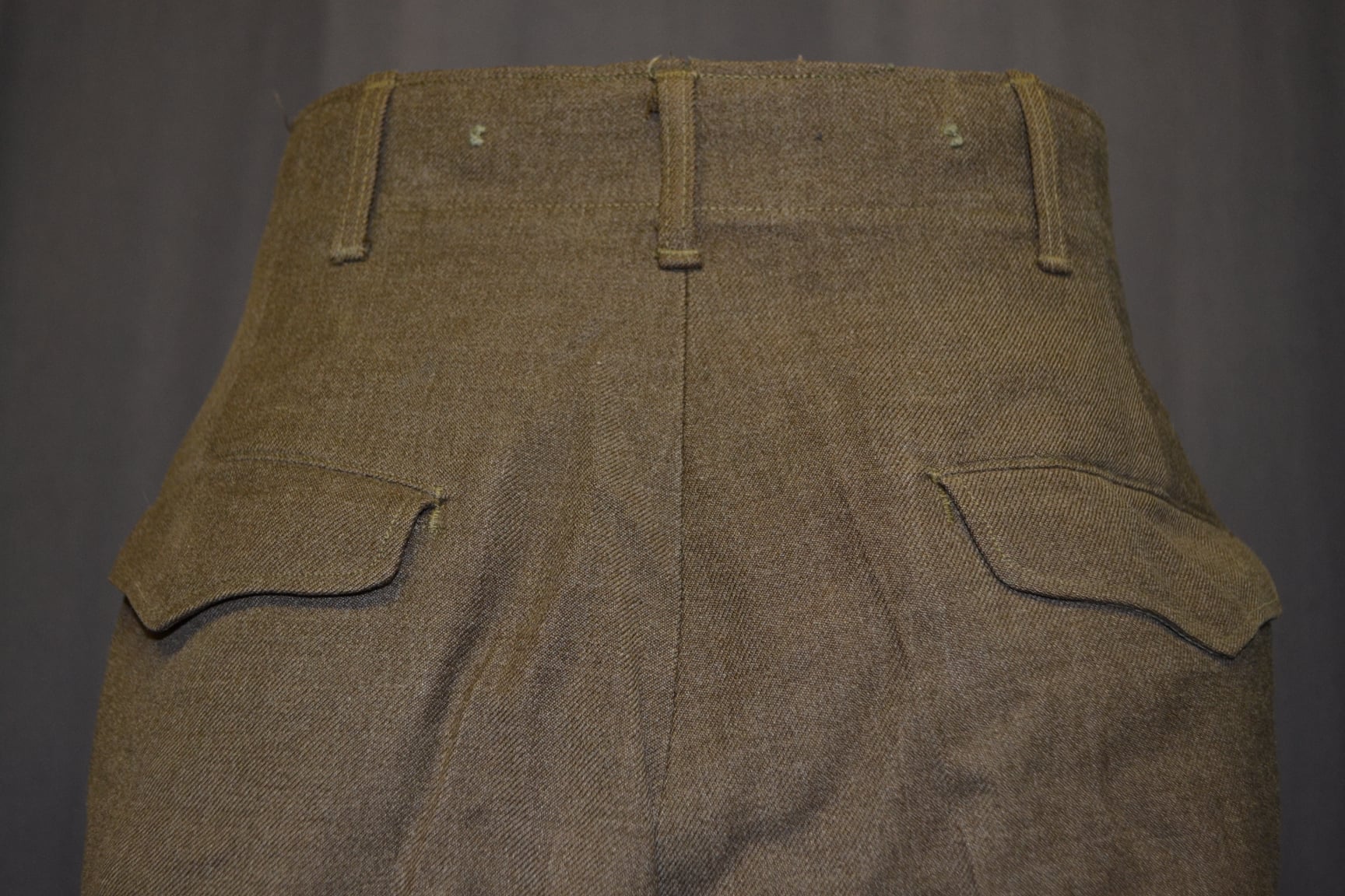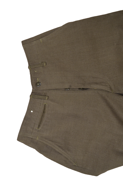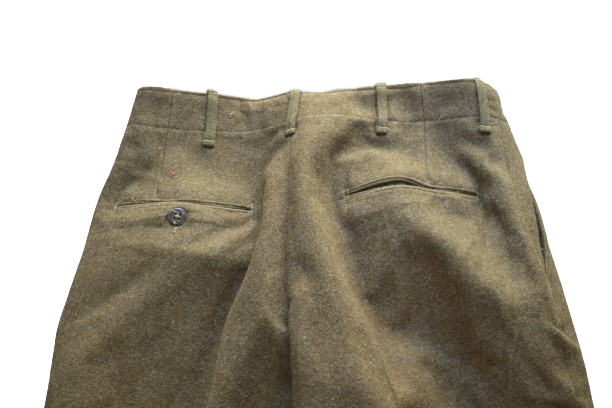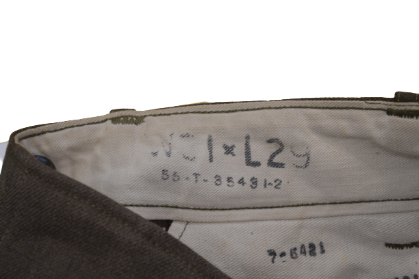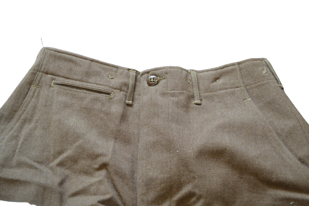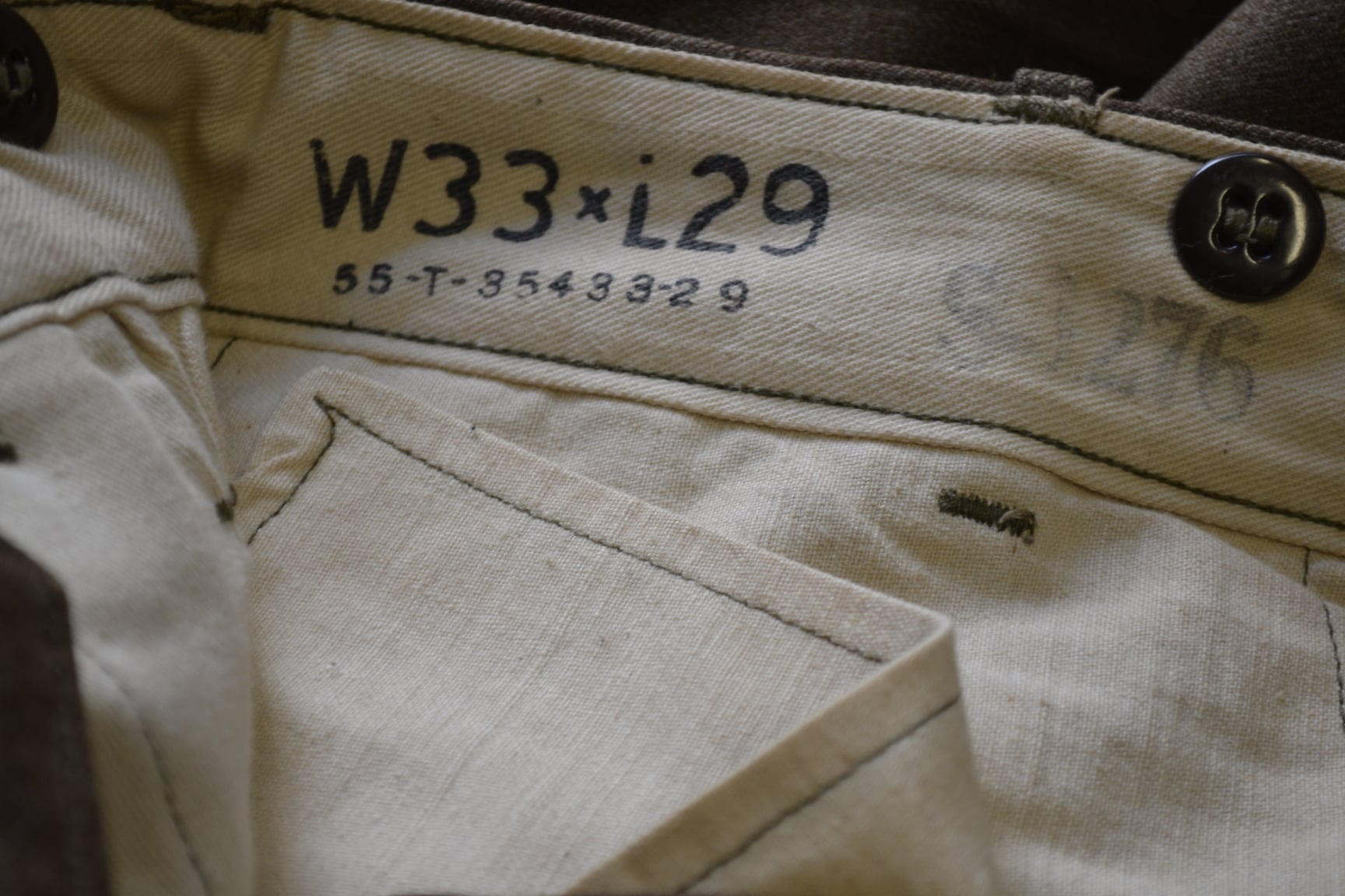 Pantalon OD33 18Oz (TROUSER FIELD) 32x31 85.0 EUR TROUSERS FIELD WOOD SERGE OD33 18oz SPECIAL  superbe pantalon en (serge) de teinte brune , il sera distribuée  dans les dernier mois de la guerre , datée 4 décembre 1944     size 32x31 largeur 38cm...