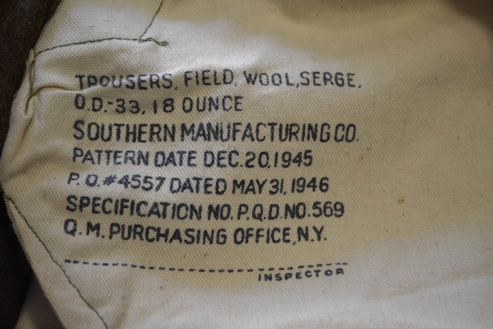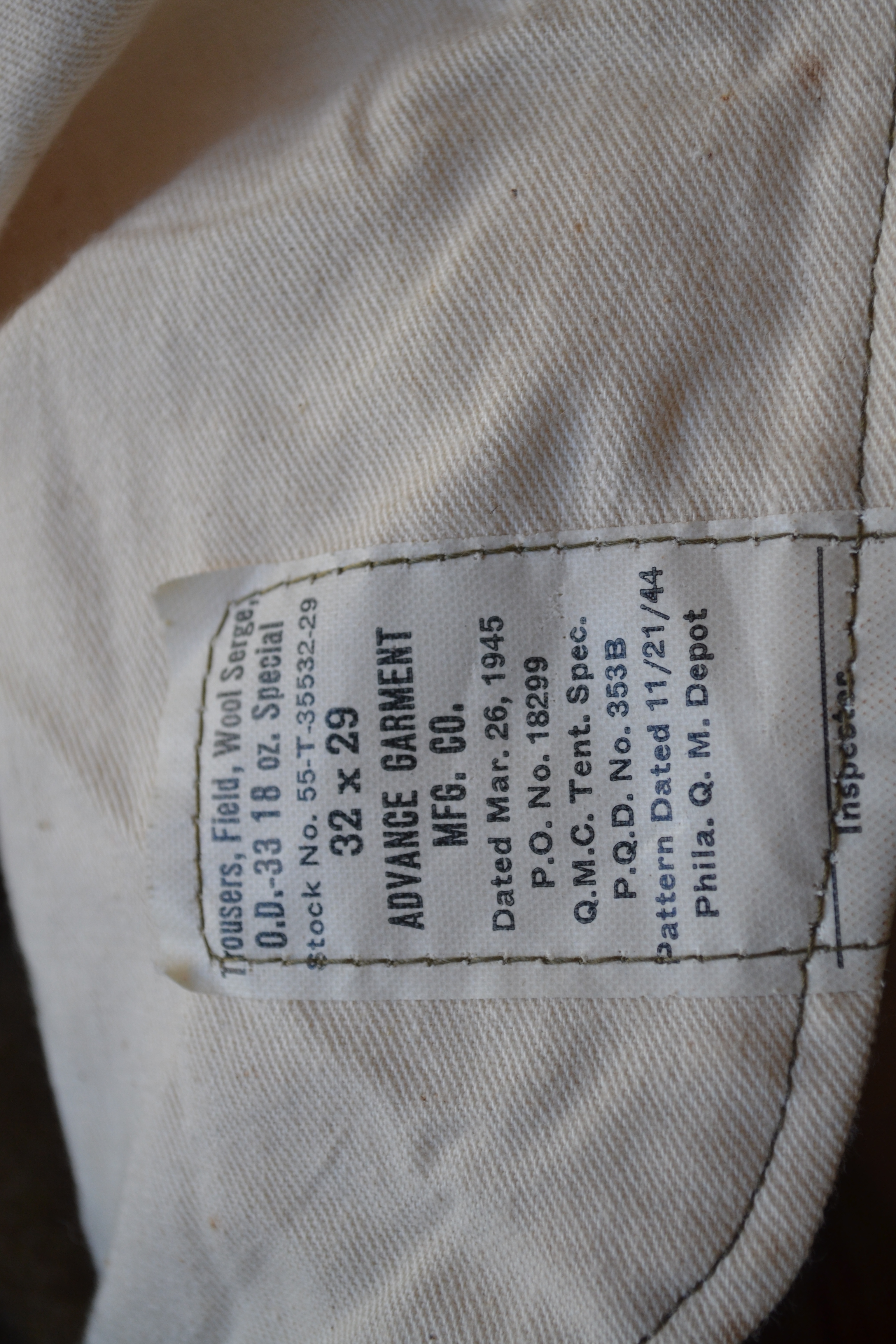 trousers field wool serge O.D-33. 18 ounce 75.0 EUR trousers field wool serge O.D-33. 18 ounce pantalon us de manufacture du 20 décembre 1945 , datée 31 mai 1946 . size us w33xL29 LARGEUR 40Cm longueur 106 Cm idéal pour montée un mannequin de sortie...