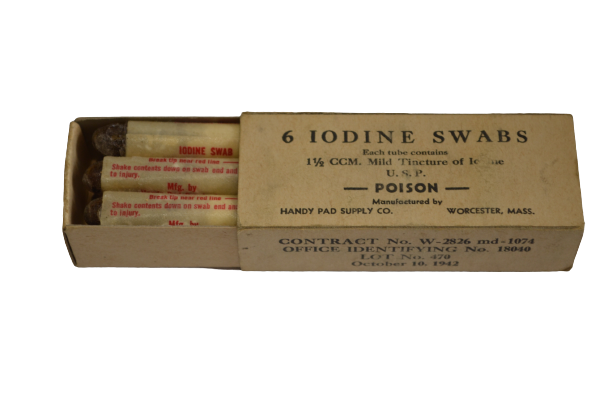 Boite tampons teinture d'iode, Iodine 1942 45.0 EUR En très bon état, un paquet complet d’iode de l’armée américaine daté de 1942. L’emballage contient six applicateurs d’iode destinés au nettoyage et à la désinfection des plaies. Fabriqué par Handy...