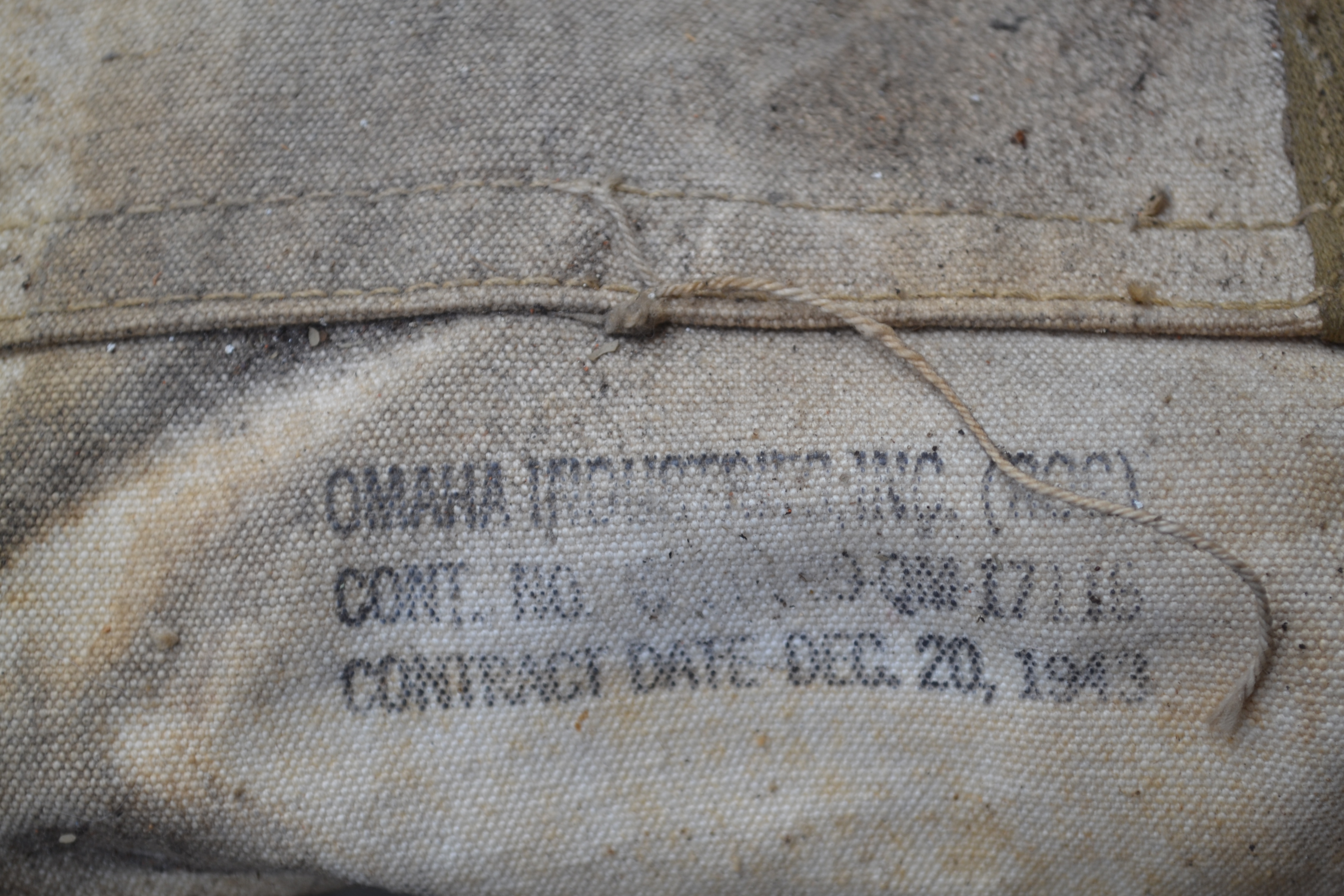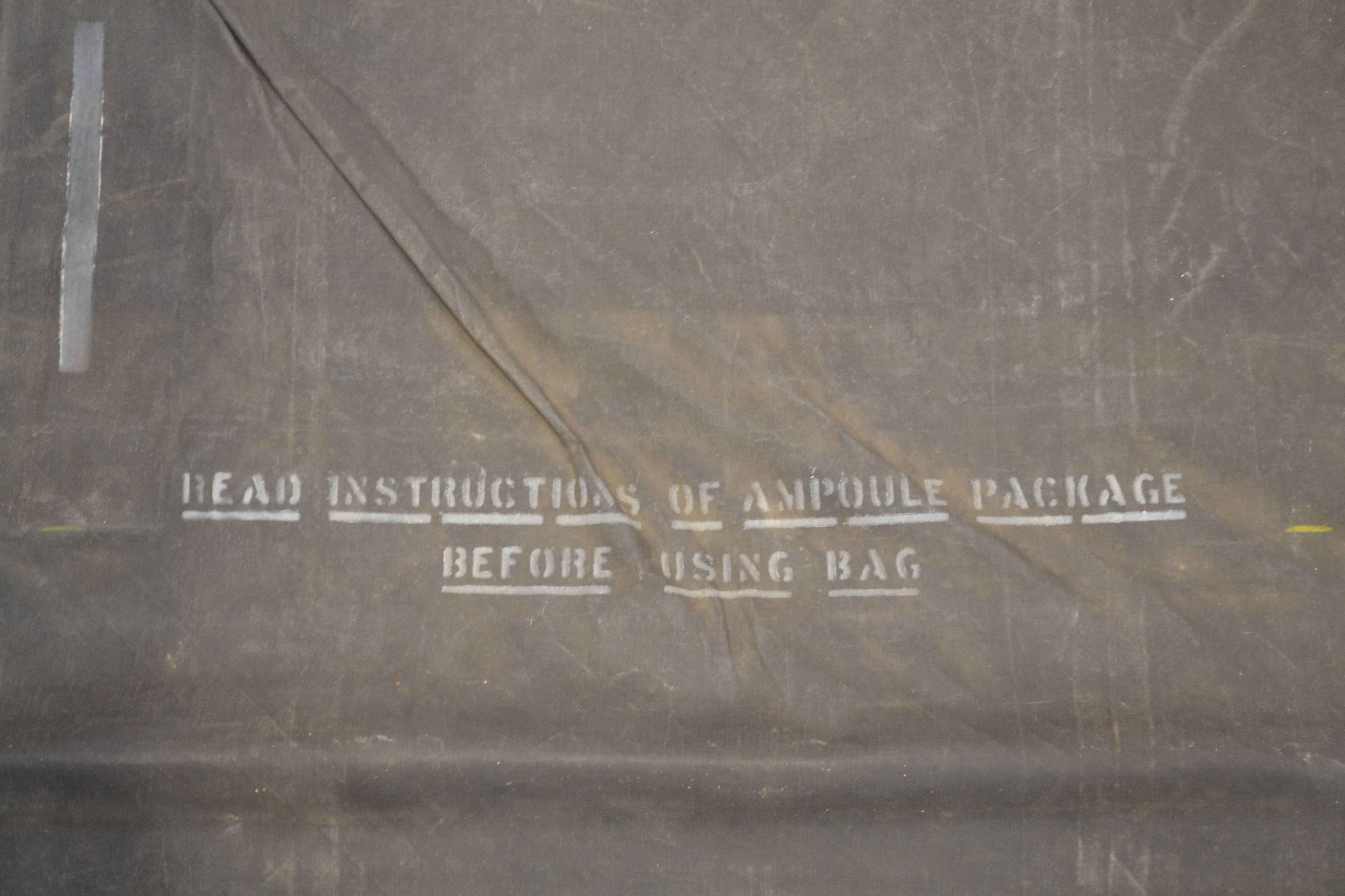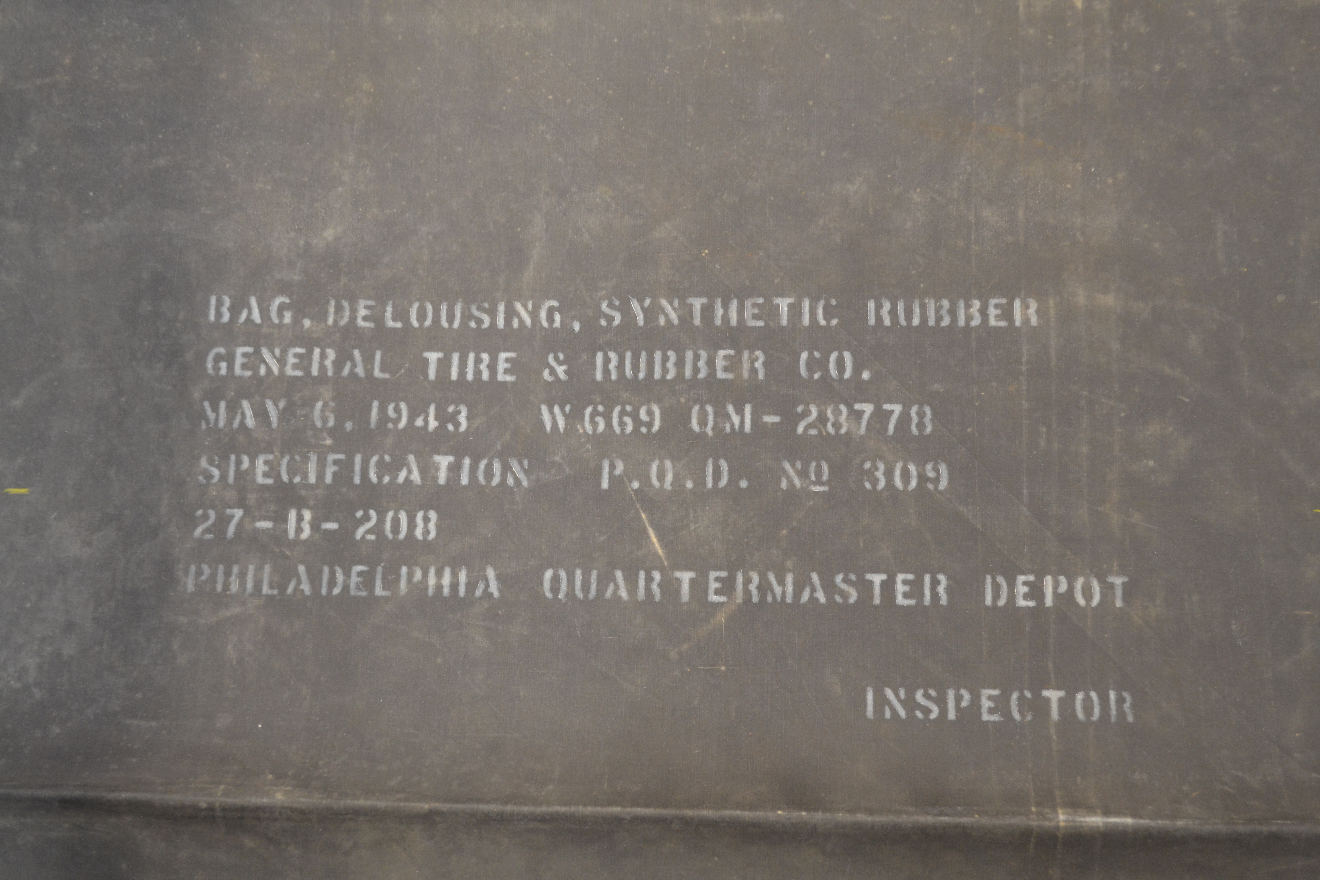 HOUSSE EN CAOUTCHOUC POUR L'ÉPOUILLAGE DES VÊTEMENTS 1943 70.0 EUR En toile caoutchouté. Toutes les sangles de fermetures sont présentes. Fabrication General tire & rubber Co. Daté du 6 mai 1943.  Sac permettant d’épouiller les vêtements sales. A noter une légère...