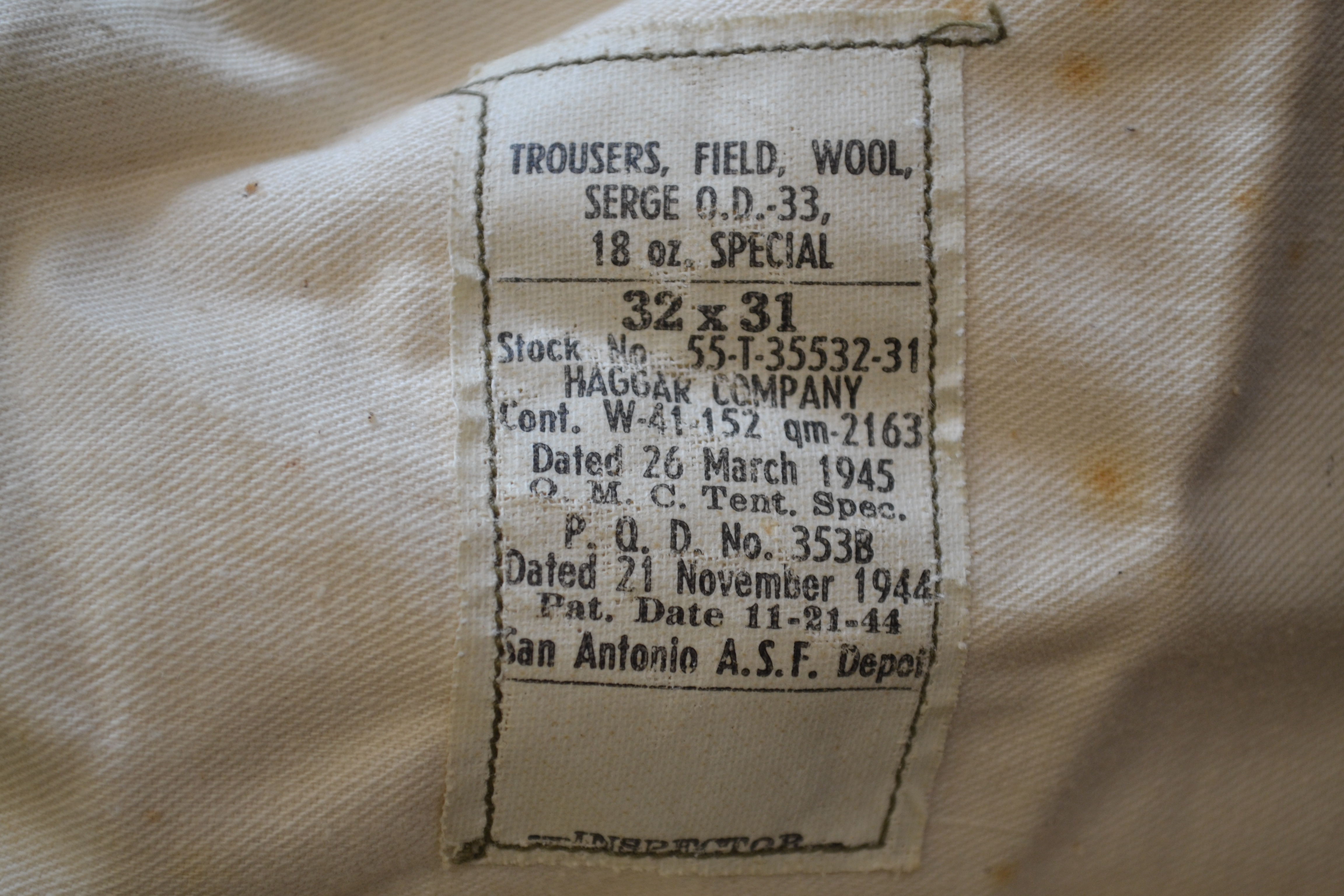 Pantalon OD33 18Oz (TROUSER FIELD) 32x31 85.0 EUR TROUSERS FIELD WOOD SERGE OD33 18oz SPECIAL  superbe pantalon en (serge) de teinte brune , il sera distribuée  dans les dernier mois de la guerre , datée 26 Mars 1945      size 32x31 largeur 38cm...