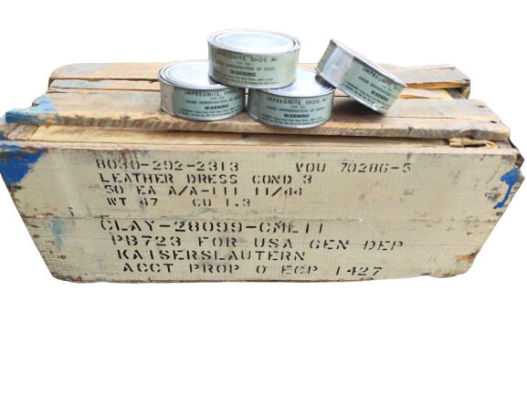 Impregnite shoe M1. US WW2 1944 15.0 EUR Boite de graisse pour l'imprégnation des chaussures contre les gaz vésicants sortie d'une caisse datée 11/1944 Vendue à l'unité, état correct, petites bosses, corrosion et/ou rayures voire trace de...