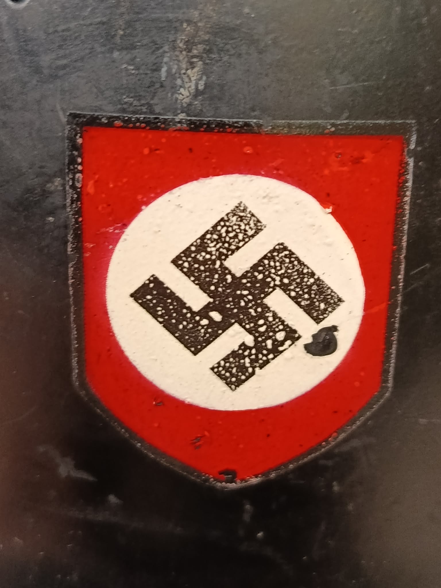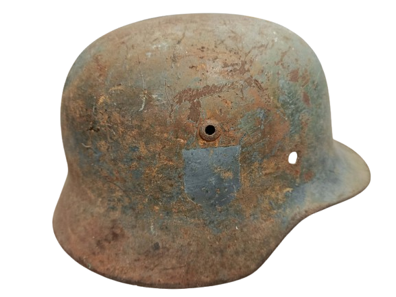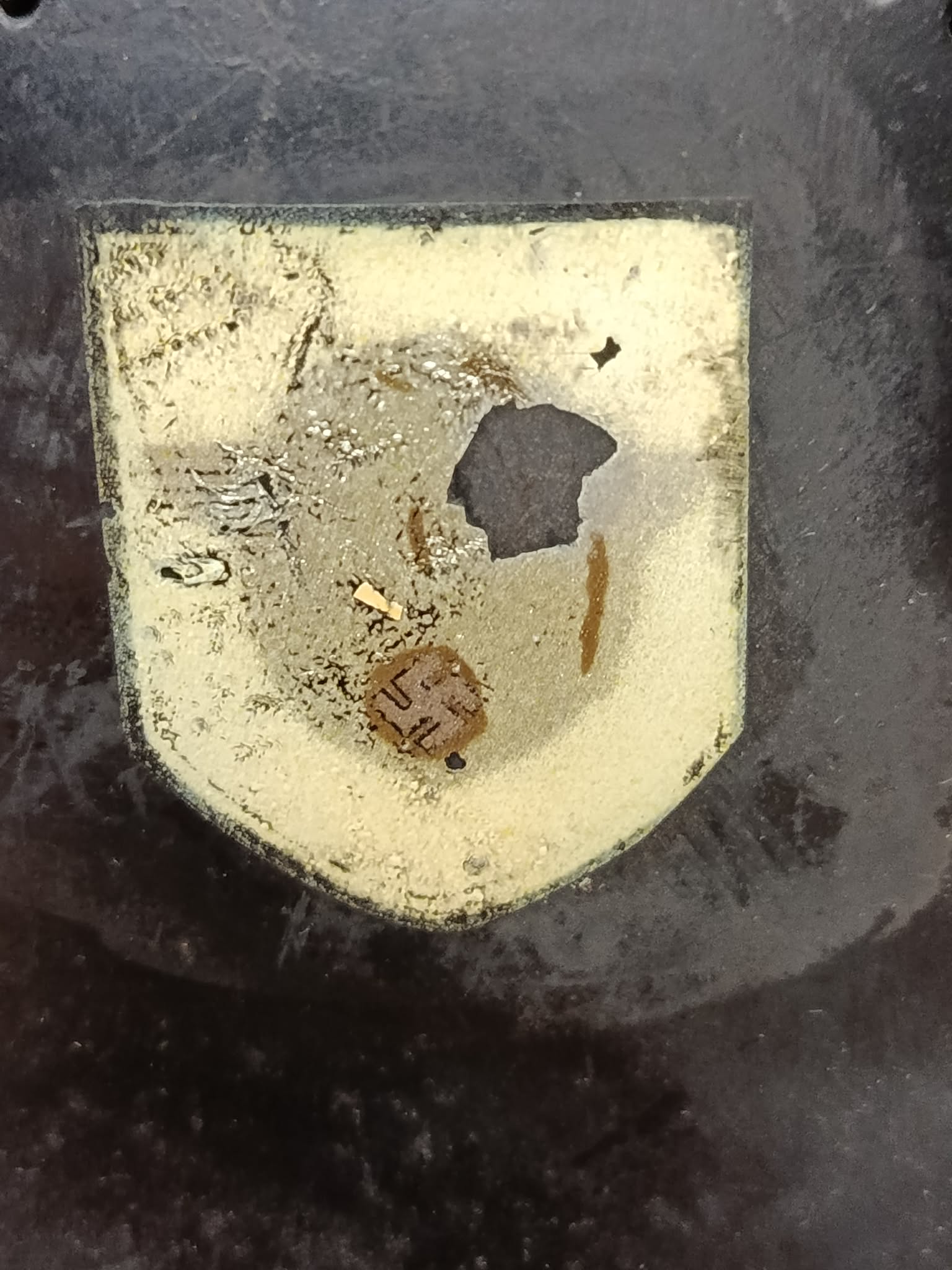 coque de casque allemand M35 double insignes Luftwaffe malheureusement l'insigne tricolore à été grattée , couleur à 70% on distingue un non dans la nuque du casque non touché , non nettoyé