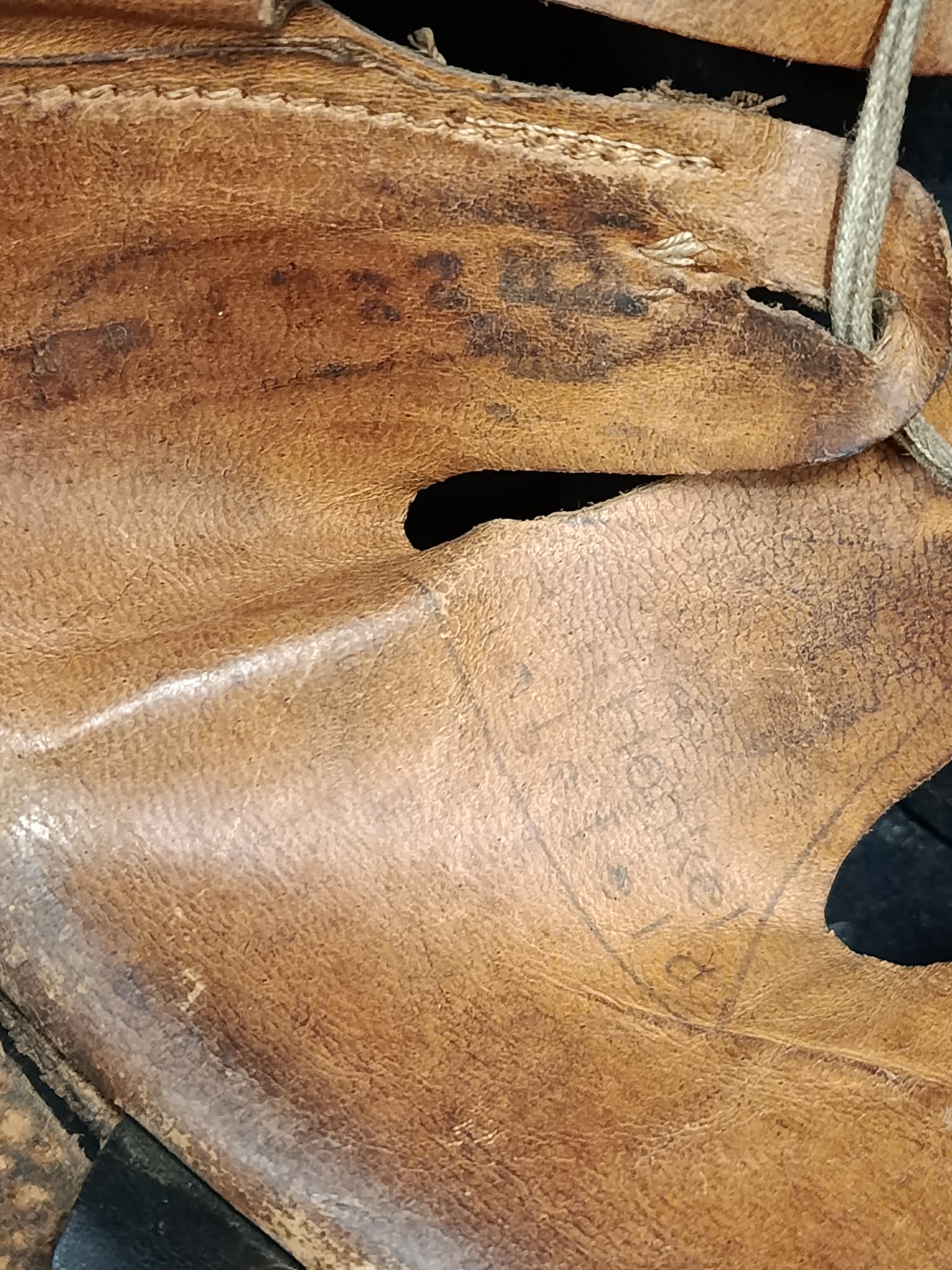 Paire de collection dans son jus. Belle patine, cuirs craquelé en surface mais encore souple. Tampons illisibles avec l'usure. Guêtrons premier type (1940-42 environ) avec absence du renfort...