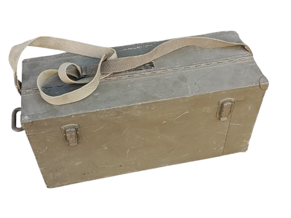 Premier modèle de boite, en métal, le crochet de fermeture est complet et fonctionnel. Sangle de transport en forte toile . Peinture à 85%. Marquages sur la face avant Chest Ammunition Cal 50 M17. ...