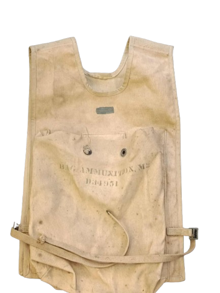 US Army “AMMUNITION BAG M2” chasuble in light khaki cotton canvas, intended for carrying ammunition and notably distributed to outfitters of collective weapons: machine gun, rocket launcher, mortar…