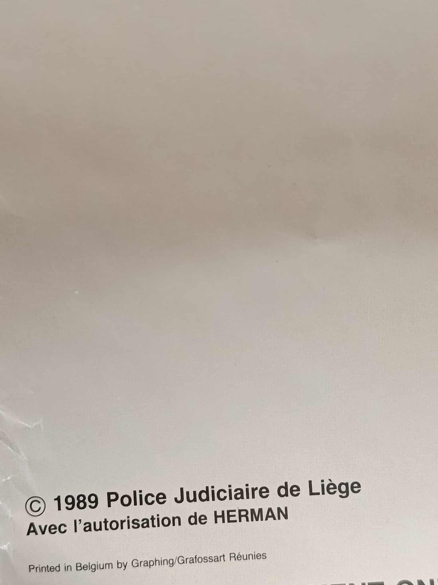 Cible d’entraiment au tir dessinée par Herman pour la Police Judiciaire de Liège en 1989. Munie de l’inscription “© 1989 Police Judiciaire de Liège. Avec l’autorisation de HERMAN