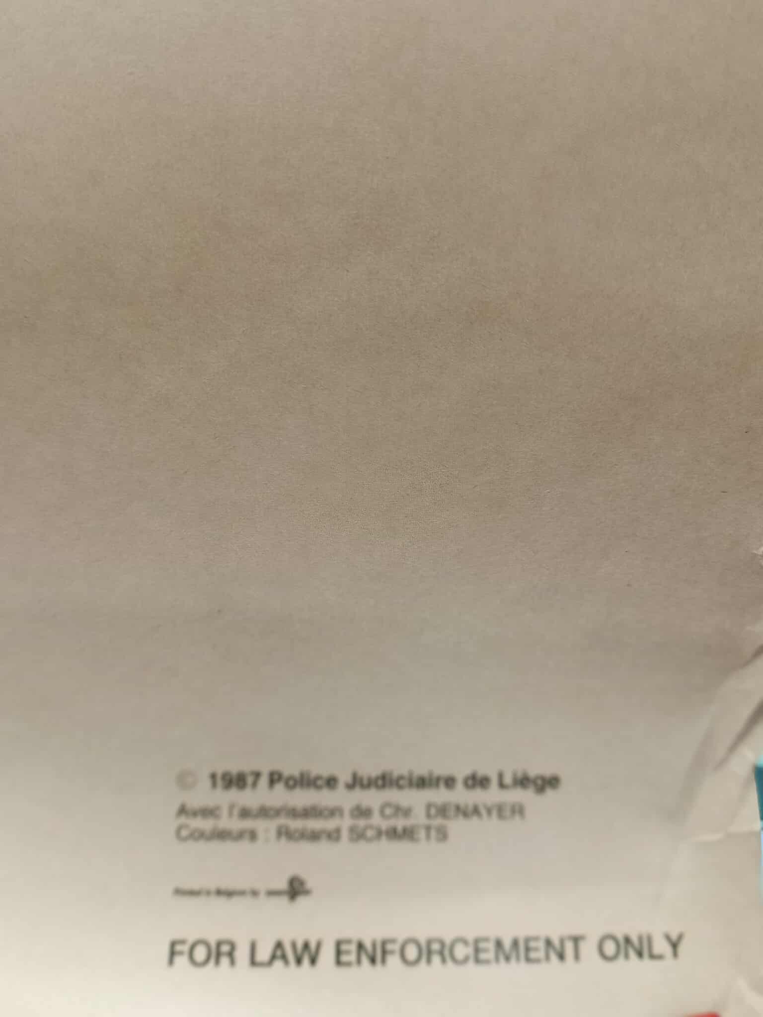 Cible d’entraiment au tir de la Police Judiciaire de Liège en 1987. Munie de l’inscription “© 1987 Police Judiciaire de Liège. Avec l’autorisation de DENAYER