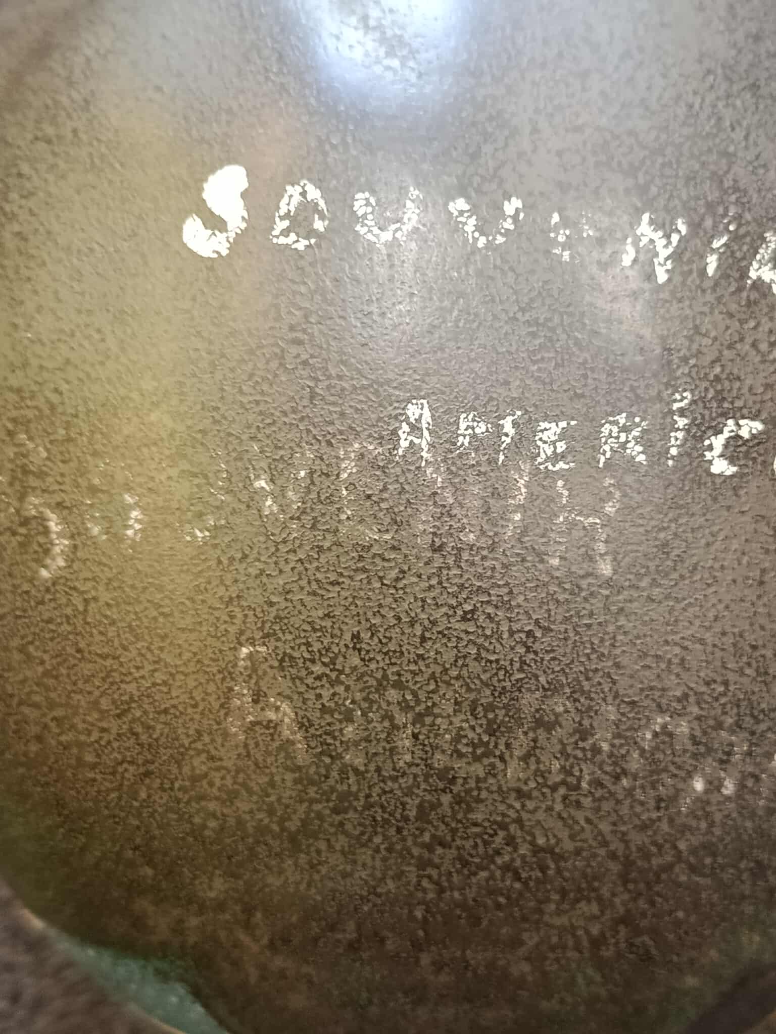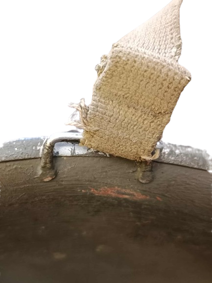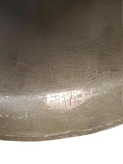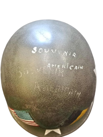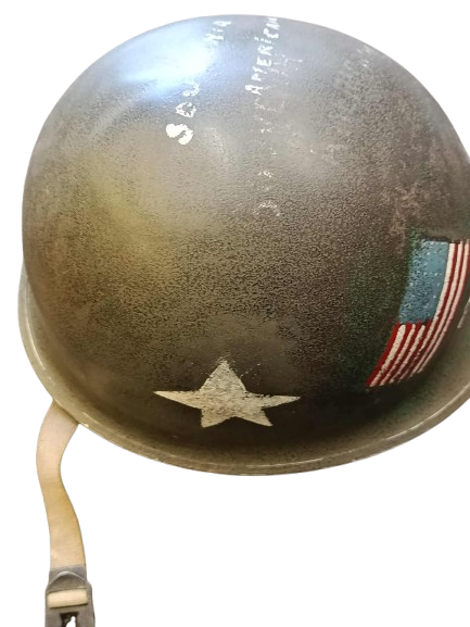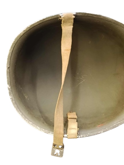 casque M1 de l'US Army, d'origine Deuxième Guerre, à pattes fixes et jonc avant,. Numéro de coque 717B. Jugulaire en toile type avec crochet et boucle en fer marquage souvenir ,