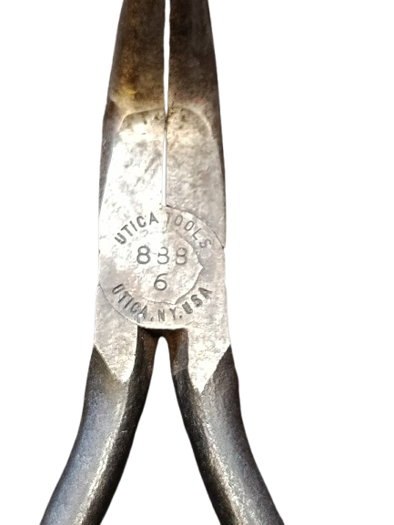 pince à bec aigu courbé de 6 pouces modèle 888-6 d’Utica, avec des vues sur le côté et le haut. Les pinces sont marquées « Utica 888-6 » et « Utica, N.Y. USA » près du pivot, et les poignées sont lisses, sans motif d’adhérence.