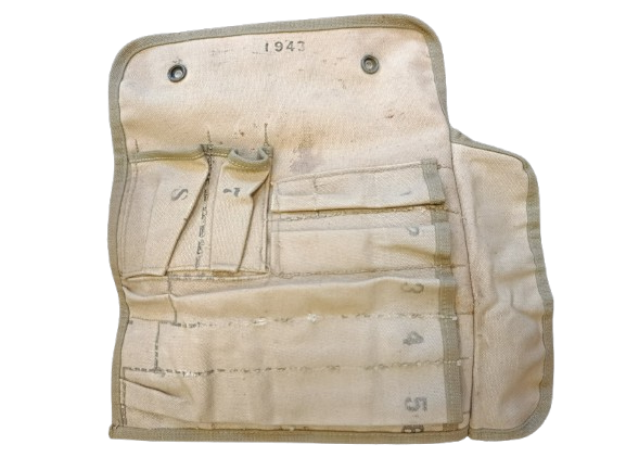 La Spare Parts Roll M14 est une trousse à outils et pièces de rechange d'origine militaire, initialement conçue par l'armée américaine durant la Seconde Guerre mondiale. Elle servait à transporter les accessoires et pièces de maintenance pour les mitrailleuses Browning de calibre .30 et .50. d'origine ww2 couleur OD3